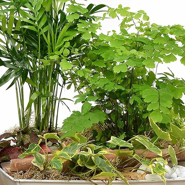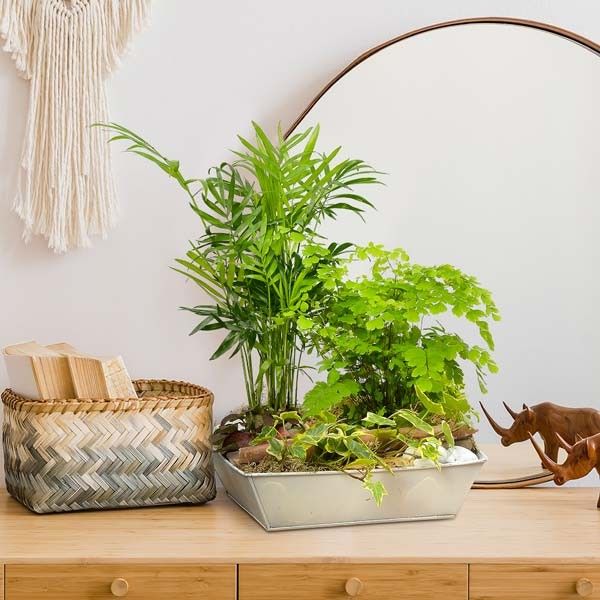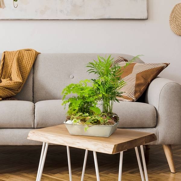 Un petit jardin d'intérieur tout en nuances de vert, avec plusieurs plantes aux feuillages variés qui créent ensemble une jolie harmonie. Cette composition végétale apporte de la fraîcheur et du calme dans votre pièce. Les plantes sont faciles à vivre et demandent juste un arrosage régulier pour s'épanouir durablement. Un cadeau parfait pour ceux qui aiment avoir de la verdure autour d'eux sans se compliquer la vie.