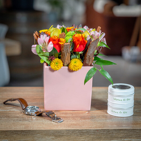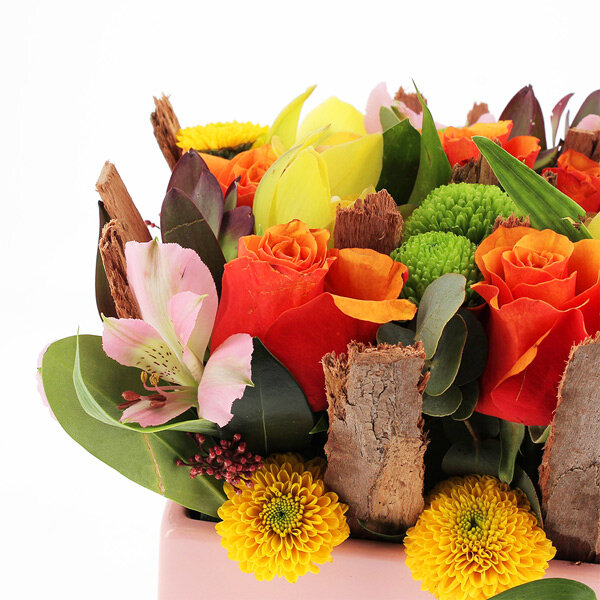 Composition piquée dans les tons orange, jaune, vert et rose composée de roses, alstromerias et autres fleurs de saison dans un contenant carré (le contenant peut varier en fonction des disponibilités).