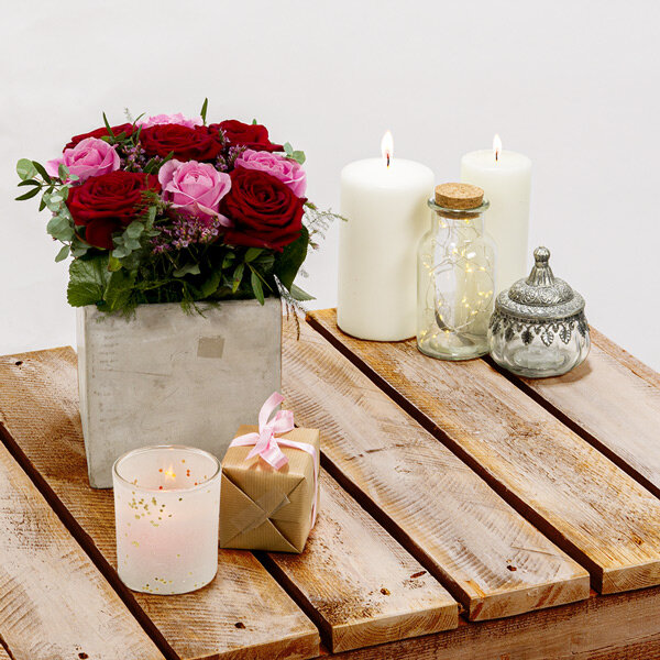 Composition piquée dans les tons rouge et rose composé de roses et feuillages. Le contenant peut varier en fonction de la disponibilité du fleuriste en charge de votre commande.