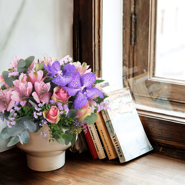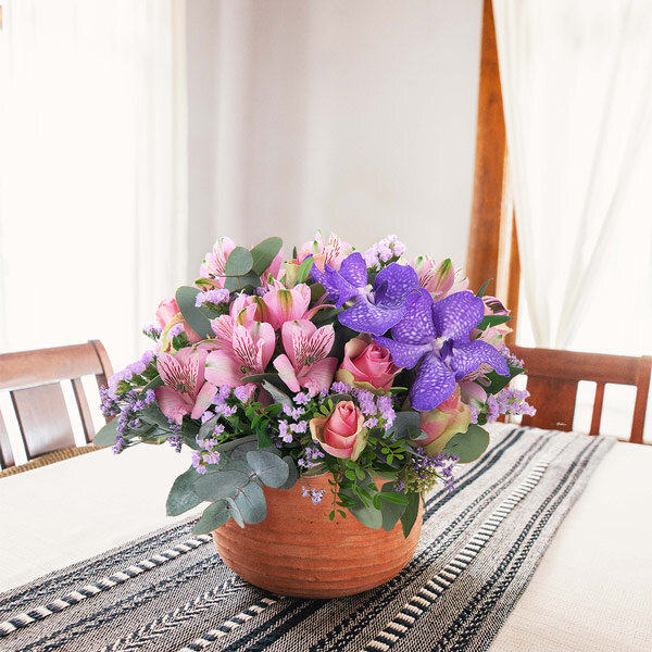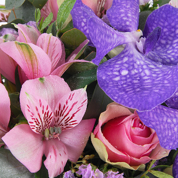 Composition piquée dans les tons rose et violet, composée d'alstromerias, de têtes d'orchidées, de roses et autres fleurs de saison, le tout dans un contenant. Le contenant peut varier en fonction de la disponibilité du fleuriste en charge de votre commande.
