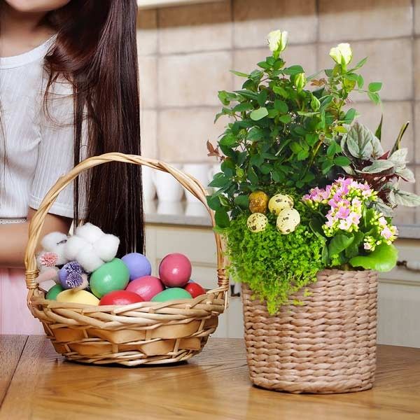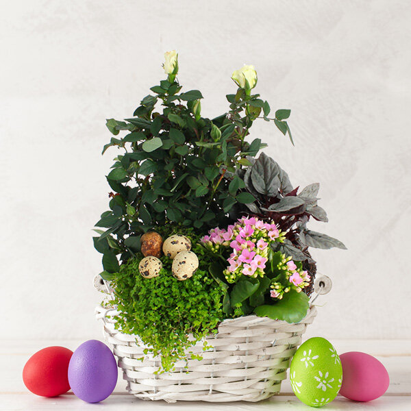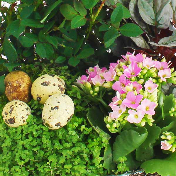 Petit rosier blanc et kalanchoé rose tendre servent d'écrin aux petits œufs fétiches de cette période Pascale. Cette jolie coupe de plante pourra être démultipliée lorsque le besoin s'en fera sentir afin que chaque essence poursuive séparément une longue vie vous rappelant ainsi au bon souvenir de son destinataire.