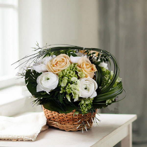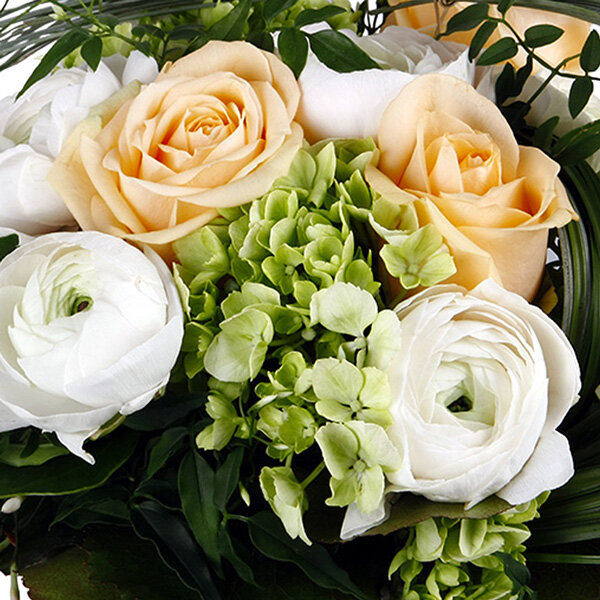 L'hortensia, la rose et la renoncule prêtent leur élégance à cette merveilleuse composition que rythme la gracieuse envolée du feuillage. Nos artisans fleuristes ont souhaité une composition qui allie tendresse et caractère, Venise a vu le jour.