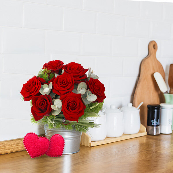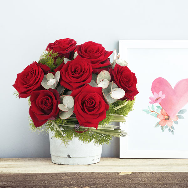 Composition piquée composée de roses rouges et feuillages dans son contenant. Le contenant peut varier en fonction de la disponibilité du fleuriste en charge de votre commande.