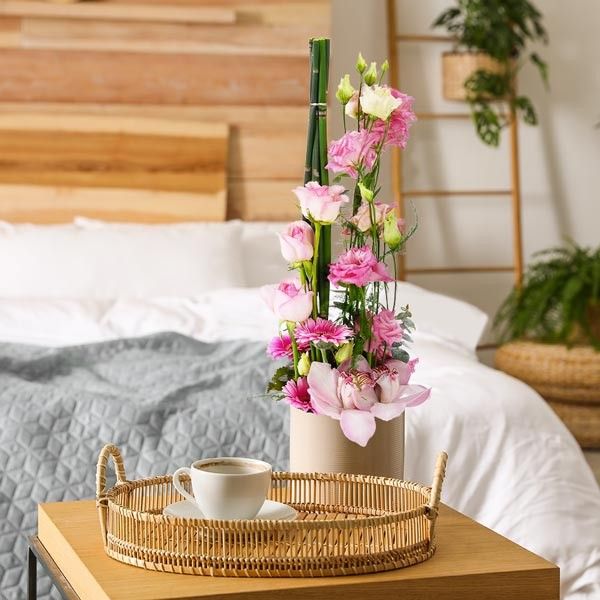 Composition piquée dans la mousse hydrophile travaillée en verticalité. Les roses qui s’échelonnent donnent une impression d’envol qu’exacerbent les tiges de bambou. Eloge de la tendresse et de la beauté féminine, cette composition est à offrir en toutes circonstances.