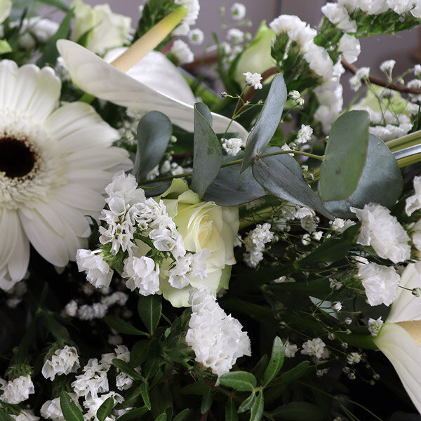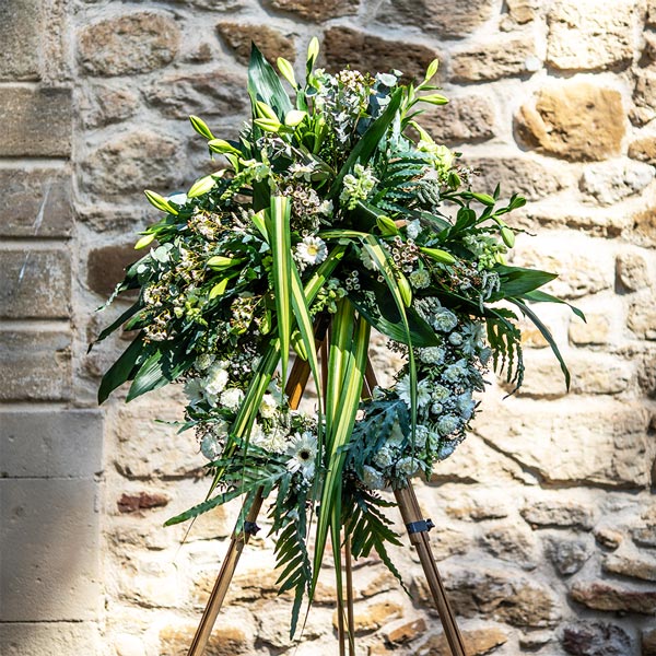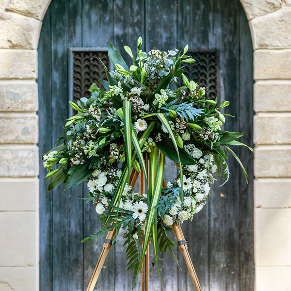 Cette couronne à fronton, réalisée par nos artisans fleuristes, allie élégance et sérénité. Le fronton, symbolise l'élévation de l'âme, apportant un hommage solennel et profond. Composée de lys, évoquant la paix et le repos éternel, et de gerberas blancs, symbole de pureté, cette création florale s'harmonise parfaitement. Ensemble, ces fleurs créent une beauté sobre et significative. Cette œuvre délicate invite au recueillement tout en célébrant la mémoire.