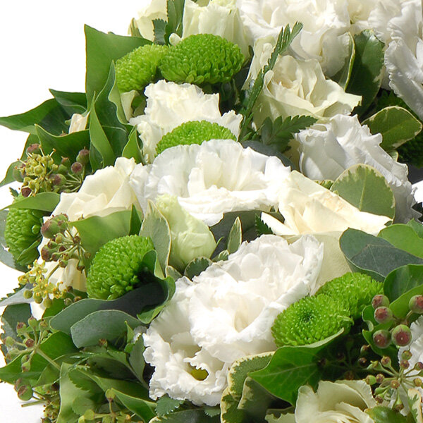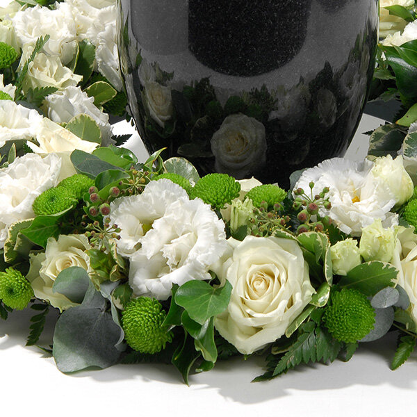 Couronne pour urne de deuil dans les tons blanc et vert composée de roses, lysianthus et feuillage. Urne non fournie.