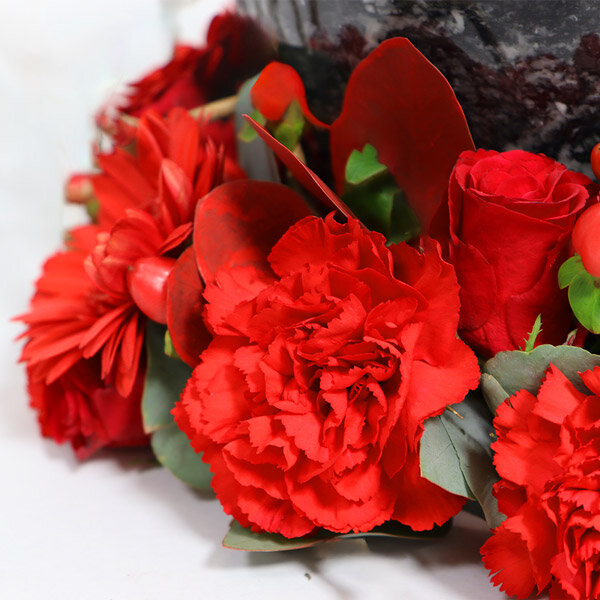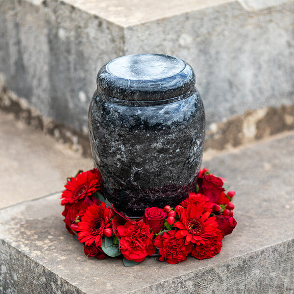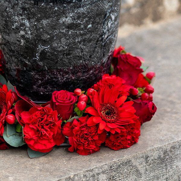 Pour accompagner l'urne de crémation, nos fleuristes ont créé "Jardin du Souvenir", une couronne de fleurs aux teintes rouges chaleureuses. Cette composition symbolise les moments de joie, d'amour et d'amitié partagés avec le défunt. La couleur rouge évoque des souvenirs précieux, apportant réconfort et sérénité en ce moment de recueillement. Chaque fleur a été soigneusement sélectionnée pour honorer la mémoire de ceux qui nous ont quittés. Ainsi, cette couronne devient un hommage touchant à la vie et aux liens tissés ensemble.
