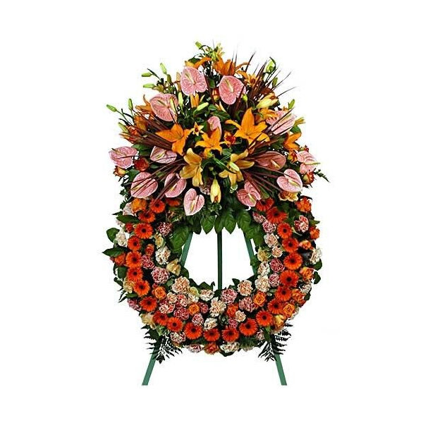Couronne dans les tons orange et roses composée de germinis orange, anthuriums roses, lys orange, œillets roses, orange et blancs, et dracena. La couronne est livrée sans trépied.