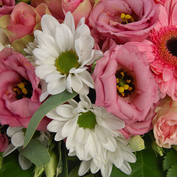 Entourée de fleurs roses et blanches, la couronne d'urne, Tendrement, déploie une poésie silencieuse autour du souvenir. Germinis, chrysanthèmes et lisianthus se mêlent dans un cercle de vie qui célèbre l’affection et le respect pour le défunt. Chaque pétale semble porter un message de tendresse, chaque nuance un souffle d’émotion. Cette couronne transforme le geste floral en un hommage profondément humain et lumineux.