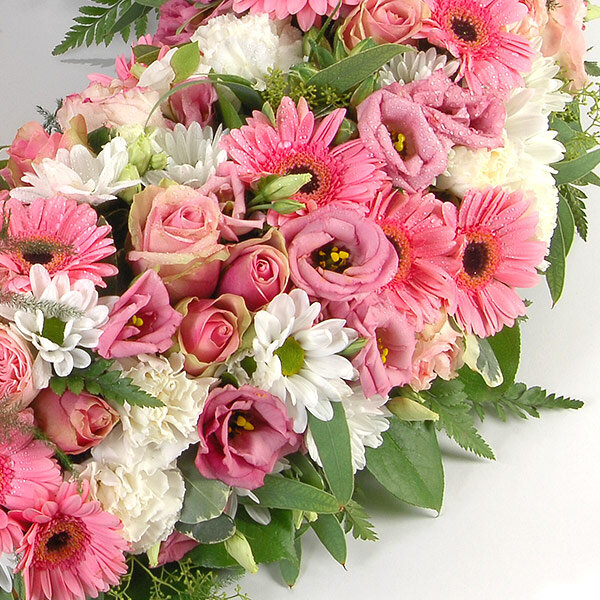 Couronne de deuil dans les tons roses et blancs, composée de germinis, chrysanthèmes, lisianthus et autres fleurs de saison.