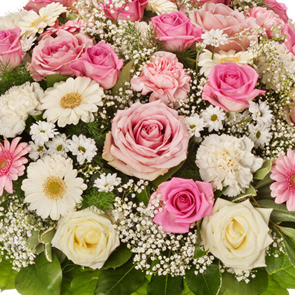 Coussin dans les tons rose et blanc composé d'aralia fastia, salal, pittosporum, mirio, santinis blancs au cœur vert, œillets blancs, roses rose soutenu et rose plus clair,gypsophile, germinis blancs, roses blanches et roses aqua.