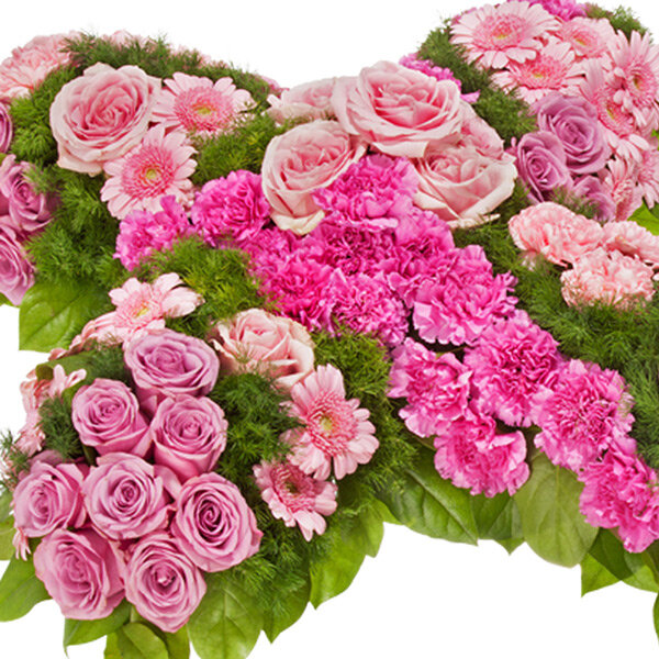 Pièce maîtresse du fleurissement deuil, la croix apporte à toute cérémonie sa symbolique religieuse. A réserver à un défunt et une famille pieuse cette belle composition de fleurs ajoute une note sacrée aux funérailles. Ici travaillée dans les tons roses elle est particulièrement adaptée à une défunte quel que soit son âge.
