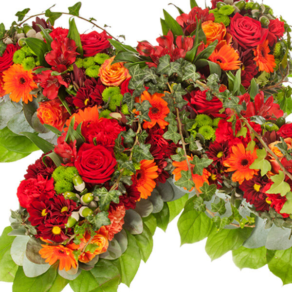 La croix est une pièce de deuil à forte symbolique. Ici sa couleur écarlate est tempérée par les touches orangées des différentes fleurs. Réservée à la famille, dans la plupart des cas, elle sera le pilier de la cérémonie.