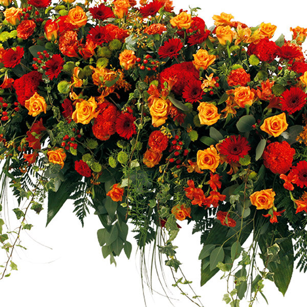 Dessus de cercueil classique dans les tons de rouge, orange et jaune, composé de germinis, rose, celosies et autres végétaux.