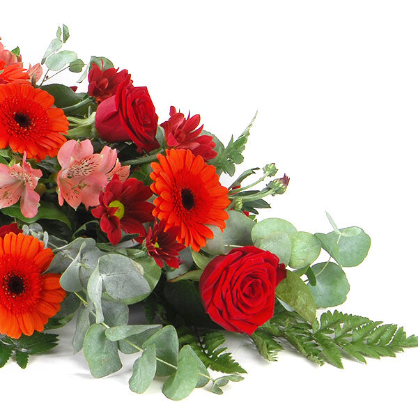 Dessus de cercueil dans les tons rouge et rose composé de roses rouges, germinis, hypéricum, le tout accompagné de feuillage.
