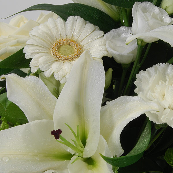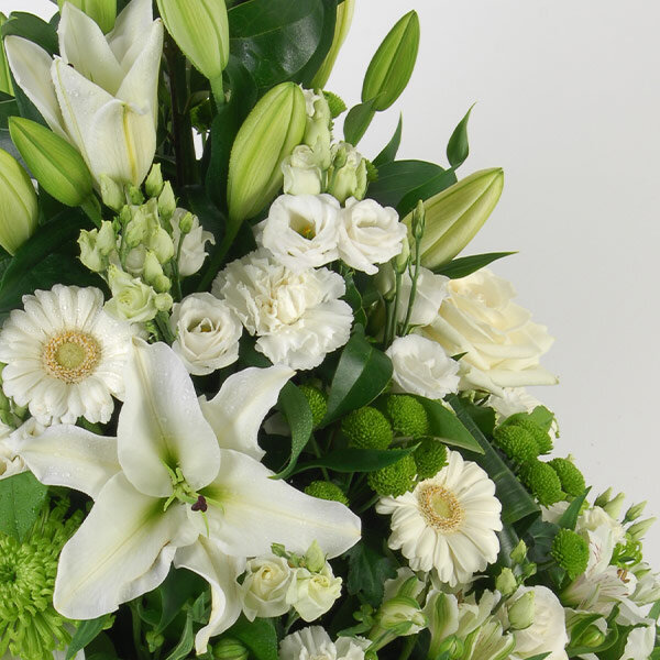 Coussin conique dans les tons blancs et verts composé de lys, germinis, oeillets et autres fleurs de saison, le tout accompagné de feuillage.