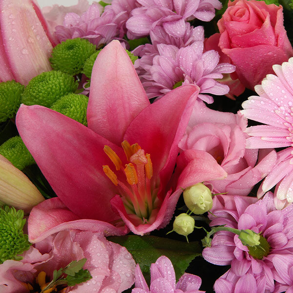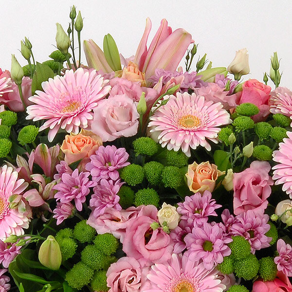 Dessus de cercueil dans les tons roses composé de gerberas, chrysanthèmes, lys et autres fleurs de saison, le tout accompagné de feuillage.
