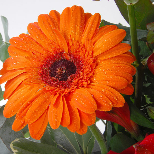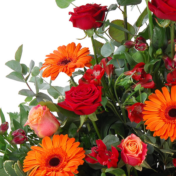 Offrez un hommage vibrant avec ce mélange harmonieux de gerberas, roses et fleurs de saison aux nuances rouges et oranges. Le feuillage ajoute profondeur et naturel à cet arrangement, idéal pour fleurir une tombe ou accompagner une cérémonie. Ses couleurs chaudes symbolisent l'amour et le souvenir vivant du défunt.