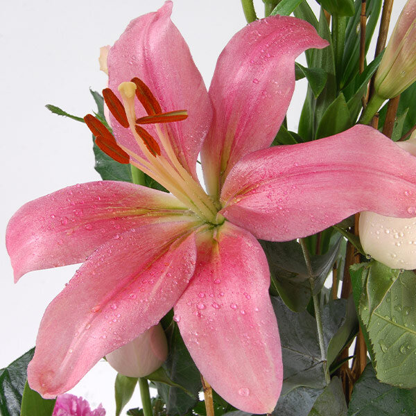Ce devant de tombe se distingue par ses tons roses doux et harmonieux, composés de lys, gerberas, roses et autres fleurs de saison. Piqué dans de la mousse et agrémenté de feuillage, cet assemblage offre une élégance naturelle pour fleurir une tombe avec délicatesse. Idéal pour accompagner une cérémonie commémorative, il transmet tendresse et respect envers le défunt. Sa palette rose apporte chaleur et émotion, rendant chaque hommage floral profondément personnel.