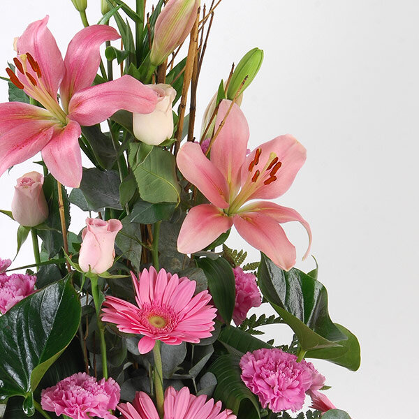 Devant de tombe dans les tons roses composé de lys, gerberas, roses et autres fleurs de saison, le tout piqué dans de la mousse avec du feuillage.