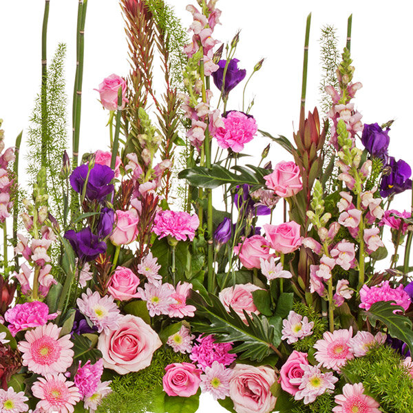 Devant de tombe travaillé dans les tons roses dynamisés par quelques touches violètes. Nos artisans fleuristes ont mis en scène l’envolée des mufliers rustiques pour servir de toile de fond à cette jolie composition. Particulièrement adaptée pour exprimer les ultimes hommages à une défunte quel qu’en soit l’âge.