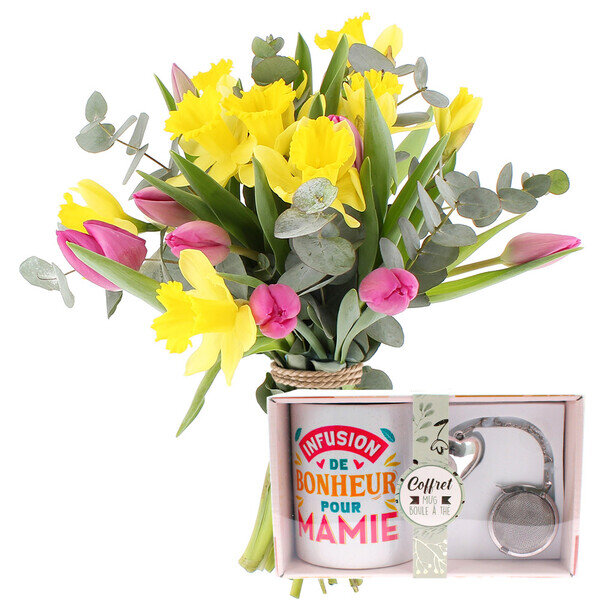 Pour la fête des grands-mères, offrez-lui un cadeau qui réchauffe le cœur ! Ce trio réunit tout ce qu'elle aime : de jolies fleurs fraîches, une tasse personnalisée pour ses pauses gourmandes et une boule à thé en forme de cœur pour préparer ses infusions préférées.