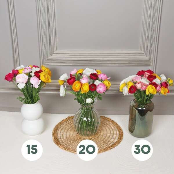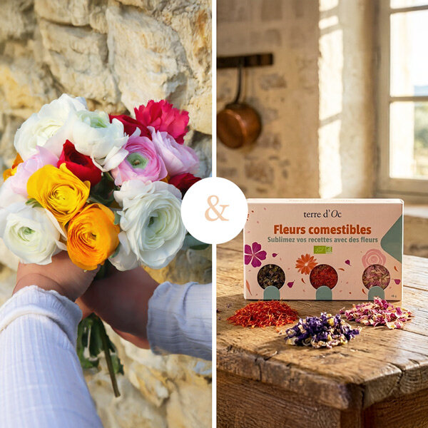 Bouquet composé de 15 renoncules françaises multicolores, accompagné de sa boîte de fleurs comestibles avec de la mauve, de la carthame et de la rose (46g).