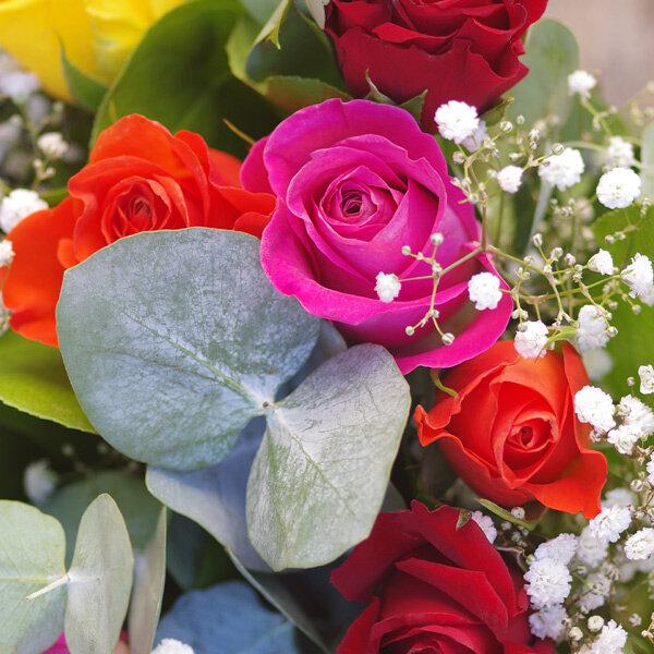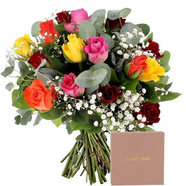 Bouquet composé de 15 roses multicolores accompagnées de gypsophile et d'eucalyptus en guise de feuillage, accompagné de son bracelet Les Mots Doux où les perles reprennent le code de l’alphabet morse pour traduire un message secret : Mamie. Bracelet fait à la main en France – Perles Miyuki 1mm – Taille ajustable (fermoir perle coulissante) – Résistant à l’eau.