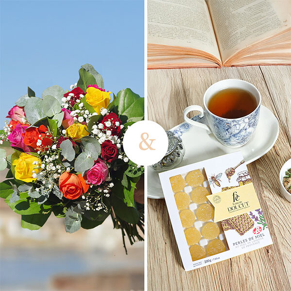 Bouquet composé de 15 roses multicolores, de gypsophile et d'eucalyptus en guise de feuillage, accompagné de perles de Miel, composées de miel de lavande de Provence, une confiserie signée François Doucet. Poids : 200g