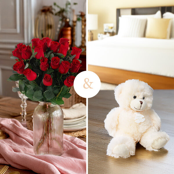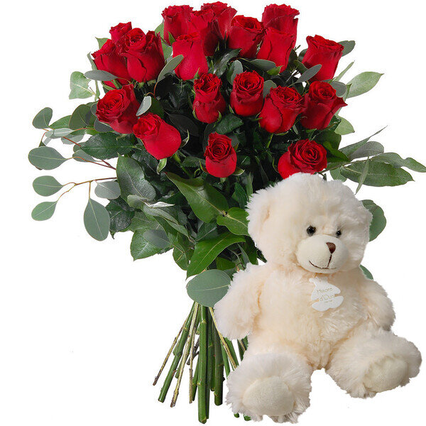 Bouquet de 20 grandes roses rouges gros boutons de 60cm, accompagné de son ours blanc en peluche signé Histoire d'Ours (30cm). Lavage en machine à 30°.