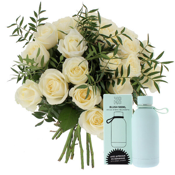 Bouquet de 20 roses blanches et pistacia, accompagné de sa bouteille isotherme en céramique «Blush Daiquiri», avec sa contenance de 500 ml et sa poignée en silicone. Parfaite pour conserver vos boissons chaudes pendant 12h ou froides pendant 24h, elle allie style et fonctionnalité.