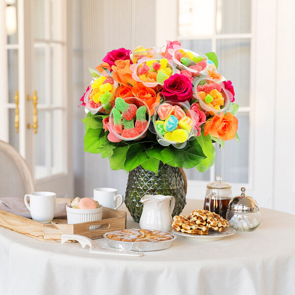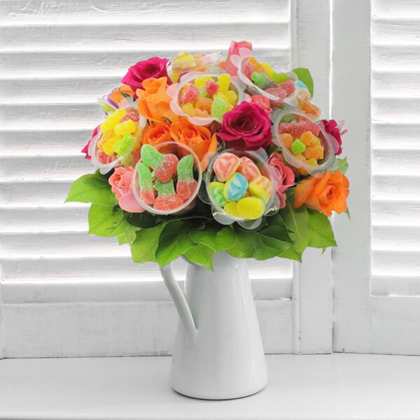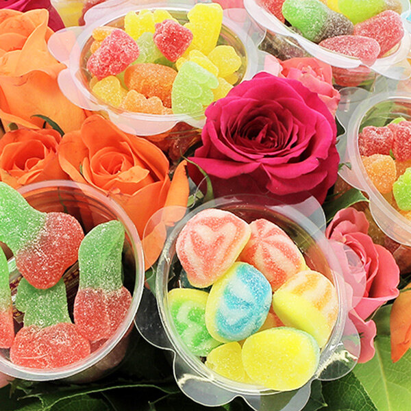 C'est la fête ! Prenez de magnifiques roses multicolores et odorantes, ajoutez feuillage et incorporez des capsules en forme de fleur remplies de généreuses gourmandises. Vous obtenez un bouquet de fleurs et de bonbons original et pétillant. Le bonbon est un pêché gourmand à consommer sans modération !