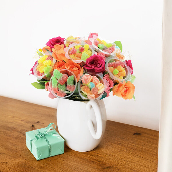 C'est la fête ! Prenez de magnifiques roses multicolores et odorantes, ajoutez feuillage et incorporez des capsules en forme de fleur remplies de généreuses gourmandises. Vous obtenez un bouquet de fleurs et de bonbons original et pétillant. Le bonbon est un pêché gourmand à consommer sans modération !