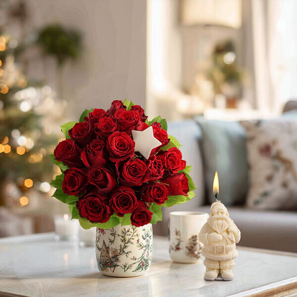 Bouquet de 20 roses rouges et son pic étoile blanche, accompagné de sa bougie parfumée en forme de Père Noël, senteur noisette. Bougie cire de soja et parfum de Grasse réalisée avec des produits Français et respectueux de l'environnement. Chaque bougie est soigneusement mélangée et coulée à la main créant ainsi une œuvre unique. En raison de la fabrication artisanale des bougies, de petites imperfections peuvent être présentes mais cela n'altère en rien leur utilisation. Retirez le ruban avant d’allumer la bougie. Poids environ 81g.