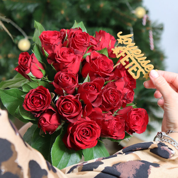 Bouquet de 20 roses rouges, accompagné de son pic Joyeuse Fêtes doré.