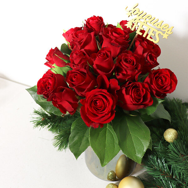 Noël est le moment de l’année où la décoration scintillante est à l’honneur, alors ne manquez pas l’occasion de séduire vos proches ! Voici le bouquet parfait : 20 roses rouges au parfum délicat, surmontées d’un scintillant pic doré, pour apporter un message de joyeuses fêtes. Un cadeau élégant et raffiné qui illuminera les fêtes de ceux que vous aimez.
