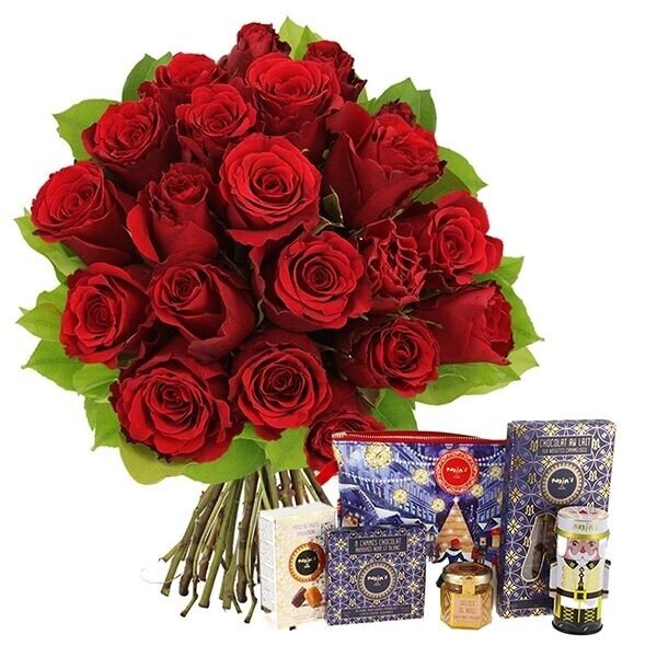 Mais pourquoi s'arrêter là ? Cette trousse s'accompagne d'un bouquet de roses rouges qui vient parfumer délicatement votre intérieur. Simple, élégant, intemporel : ce duo fleurs et chocolats apporte cette touche chaleureuse qui fait toute la magie de Noël.