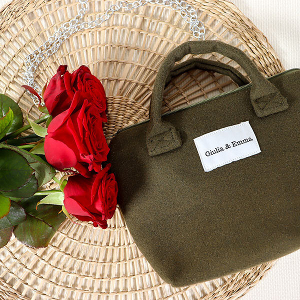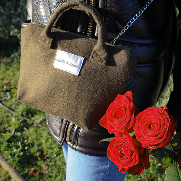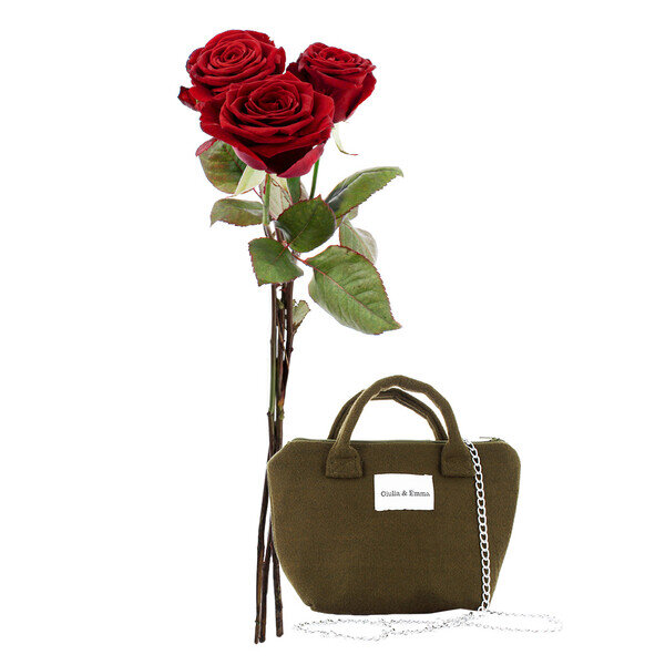 Bouquet composé de trois roses rouges, Red Naomie et d'un sac à main, modèle Mini G&E Tweed Laine Kaki de la marque Guilia & Emma. Sa matière extérieure est composée de 100 % de Tweed Laine, tandis que l'intérieur est 100 % coton, renforcé par un entoilage rigide. Dimensions : 21 centimètres de largeur / 15 centimètres de hauteur. Entretien, le sac doit être lavé à la machine uniquement.