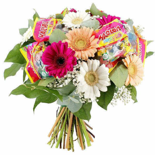 Bouquet composé de 9 germinis multicolores et de gypsophile, accompagné de 6 packs de bonbons gélifiés.