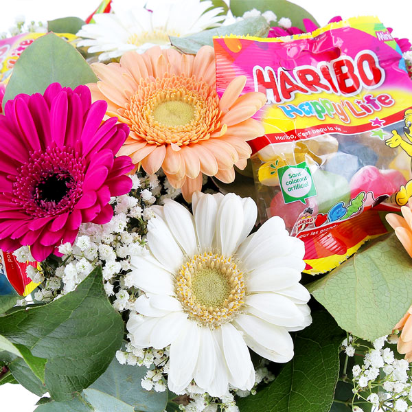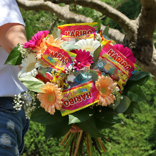 Imaginez la surprise : des fleurs éclatantes de fraîcheur... parsemées de sachets de Haribo ! Oui, vous avez bien lu. On a osé marier la douceur des germinis multicolores à la gourmandise de vos bonbons préférés, et le résultat ? Un bouquet aussi beau que délicieux !