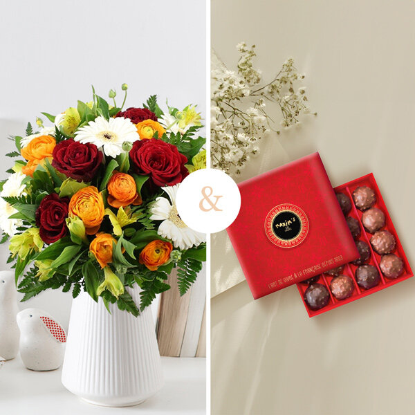 Bouquet dans les tons rond rouge, orange blanc, jaune et vert, composé de petites roses, germinis, fleurettes et feuillages, accompagné de sa boite de 16 rochers pralinés Maxim's au chocolat au lait et chocolat noir (160g).
