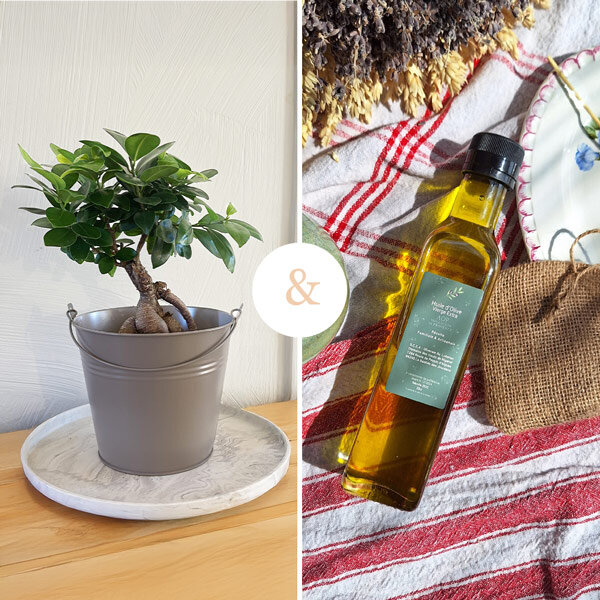 Découvrez l'art de la contemplation avec notre ensemble raffiné comprenant un bonsaï délicat accompagné de sa bouteille d'huile d'olive. Appréciez la beauté et la quiétude du bonsaï, qui apporte une touche zen à votre intérieur. Pour compléter cette expérience, profitez de la qualité supérieure de notre huile d'olive AOP de 25cl, pour des moments de dégustation uniques. Transformez votre espace en un havre de paix et savourez les bienfaits de cet ensemble harmonieux.