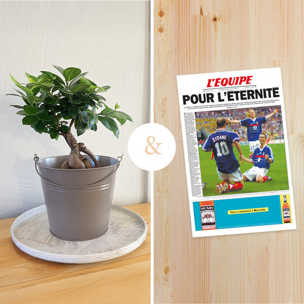 Offrez un cadeau qui se démarque par son style exceptionnel ! Notre duo cadeau pour une occasion spéciale vous propose un bonsaï en pot accompagné d'une impression personnalisée de la Une du journal Le Monde. Choisissez la date de l'impression et marquez cette journée mémorable avec cet arbre miniature emblématique. Ce cadeau unique en son genre ne manquera pas d'étonner et de ravir vos proches !
