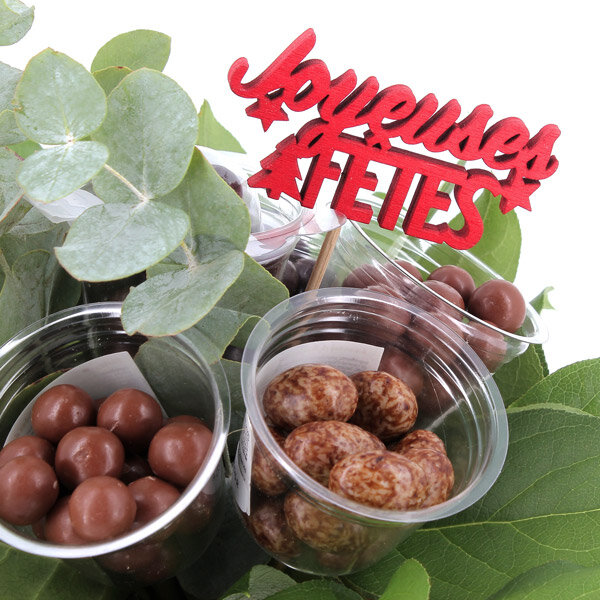 Bouquet composé de 7 paniers contenant différents chocolats variés (billes de céréales et amandes enrobées de chocolat), accompagné de feuillage et d'un pic rouge Joyeuse Fêtes.