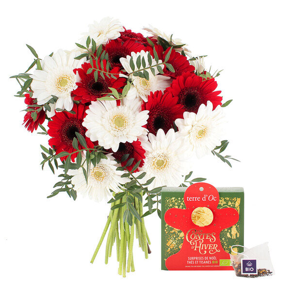 Vingt germinis éclatants jouent la carte des contrastes avec leurs pétales rouges et blancs, rehaussés par quelques branches de pistacia pour le caractère. Ce bouquet généreux s'accompagne d'un coffret gourmand en forme de pain d'épices qui cache 6 sachets de thés et infusions bio, un festival d'épices douces, de fruits et de douceurs à déguster bien au chaud. Vous pouvez l'offrir à vos proches, le partager autour d'un goûter, le poser fièrement sur la table des fêtes ou même l'accrocher au sapin pour surprendre vos invités. Un cadeau sincère qui touche juste, tout simplement.