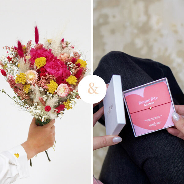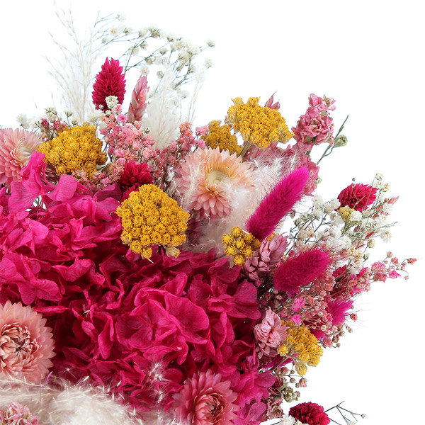 Bouquet de fleurs séchées dans les tons roses composé d'une tige d'hortensia stabilisé, d'helicrysum, de delphinium, de tarwe, de lagurus, de phalaris, de pampa, de gypsophile et d'achillée, accompagné d'un bracelet Les Mots Doux, composé d'un petit coeur plaqué or, se retrouvant au centre d'un cordon rouge d'amour.