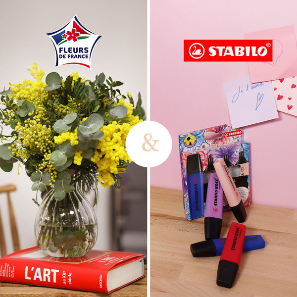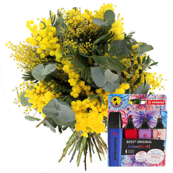 Bouquet de mimosa avec eucalyptus et pistacia, accompagné de son set de 4 surligneurs STABILO BOSS ORIGINAL NatureColor Wildflower Edition.