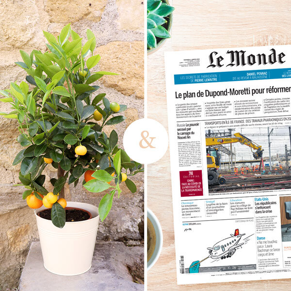 Faites sensation avec notre duo personnalisable pour une occasion spéciale : un oranger en pot et une impression de la Une du journal le Monde à la date de votre choix. Un cadeau qui fera chaud au cœur !