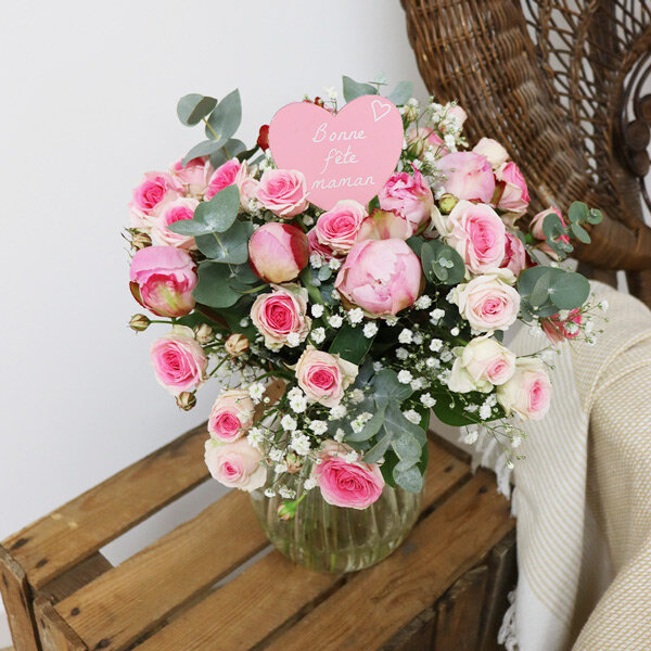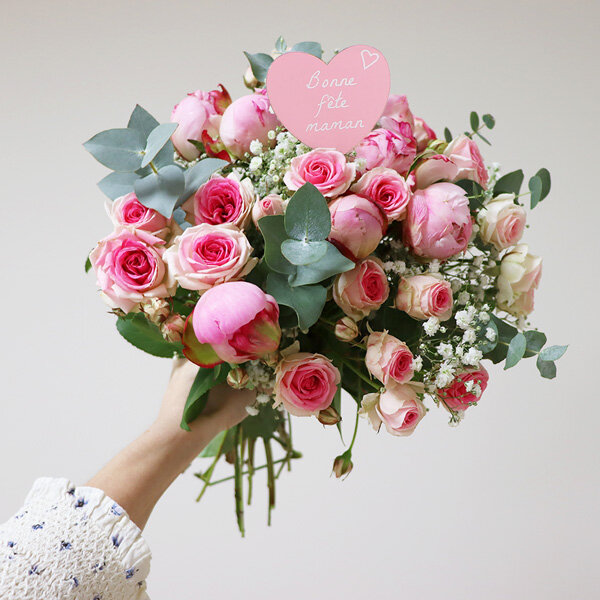 La générosité des pivoines se mêle à la délicatesse des roses mini eden, entourées de gypsophile et d'eucalyptus, pour composer notre bouquet spécial pour la fête des mères. Un cadeau floral parfait pour honorer votre maman chérie. Avec le pic rose "Bonne fête maman", votre message est mis en valeur avec tendresse et élégance.