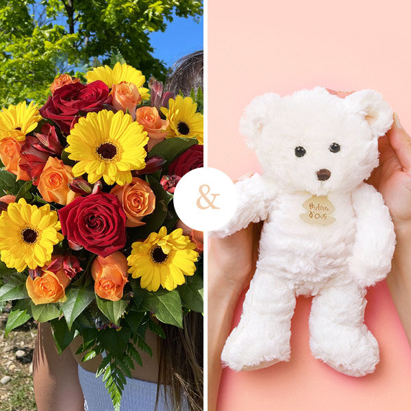 Bouquet rond coloré dans les tons rouge, orange et jaune composé de roses, germinis et autres fleurettes de saison, accompagné de son ourson en peluche (le type d'ourson dépend du fleuriste en charge de la livraison de votre commande).
